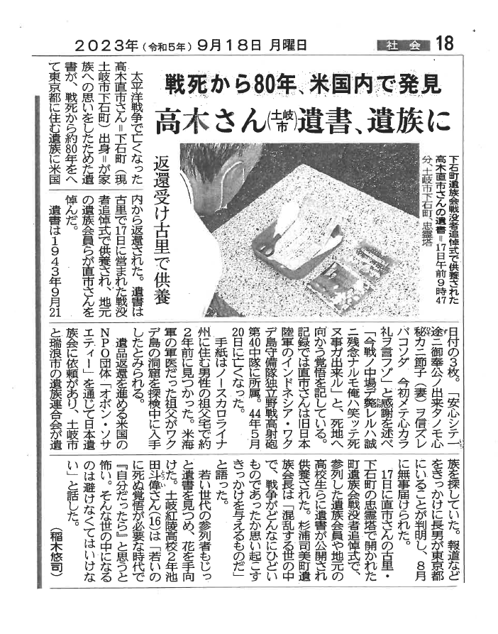 太平洋戦争で亡くなった高木直市さん(現土岐市下石町出身)の遺書が、戦死されてから八十年を経て、ご遺族に返還されました。
